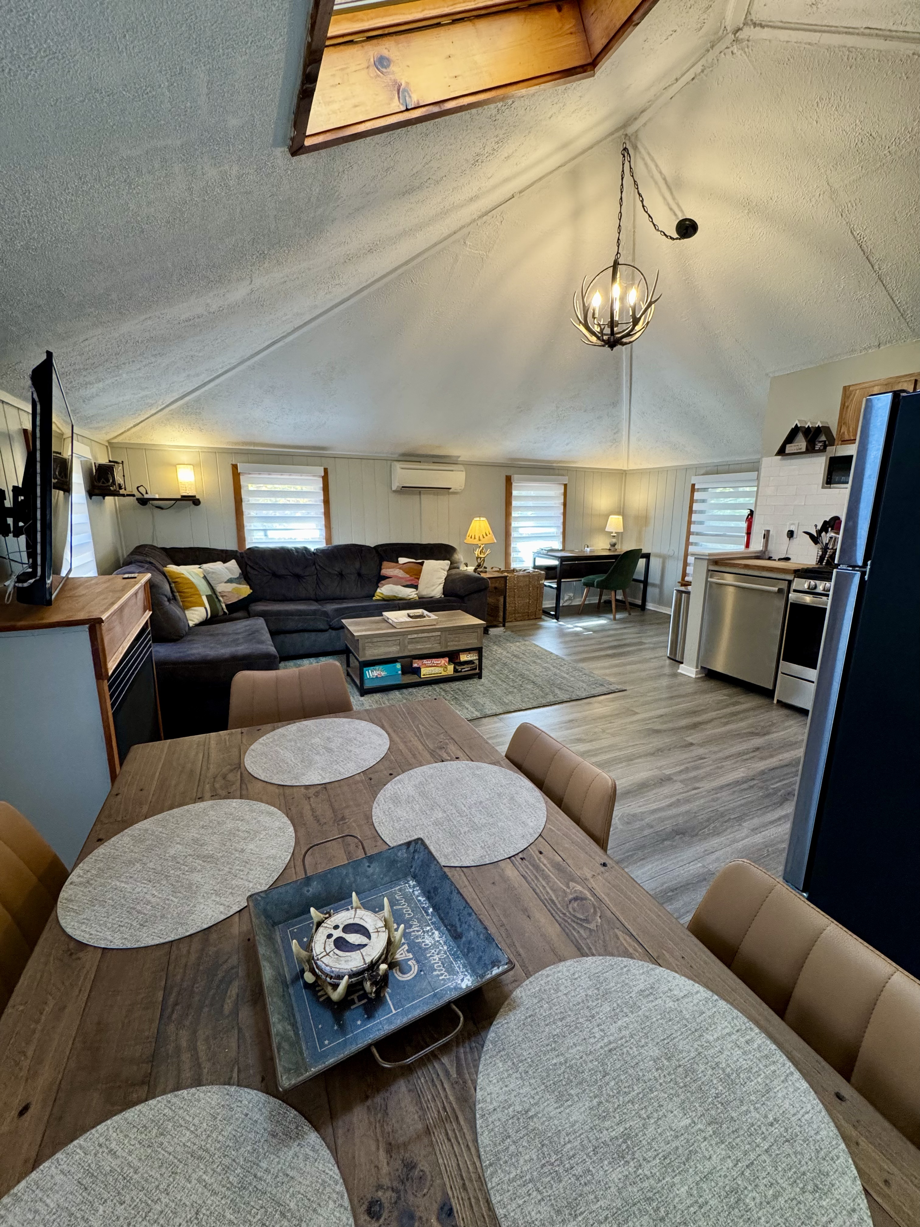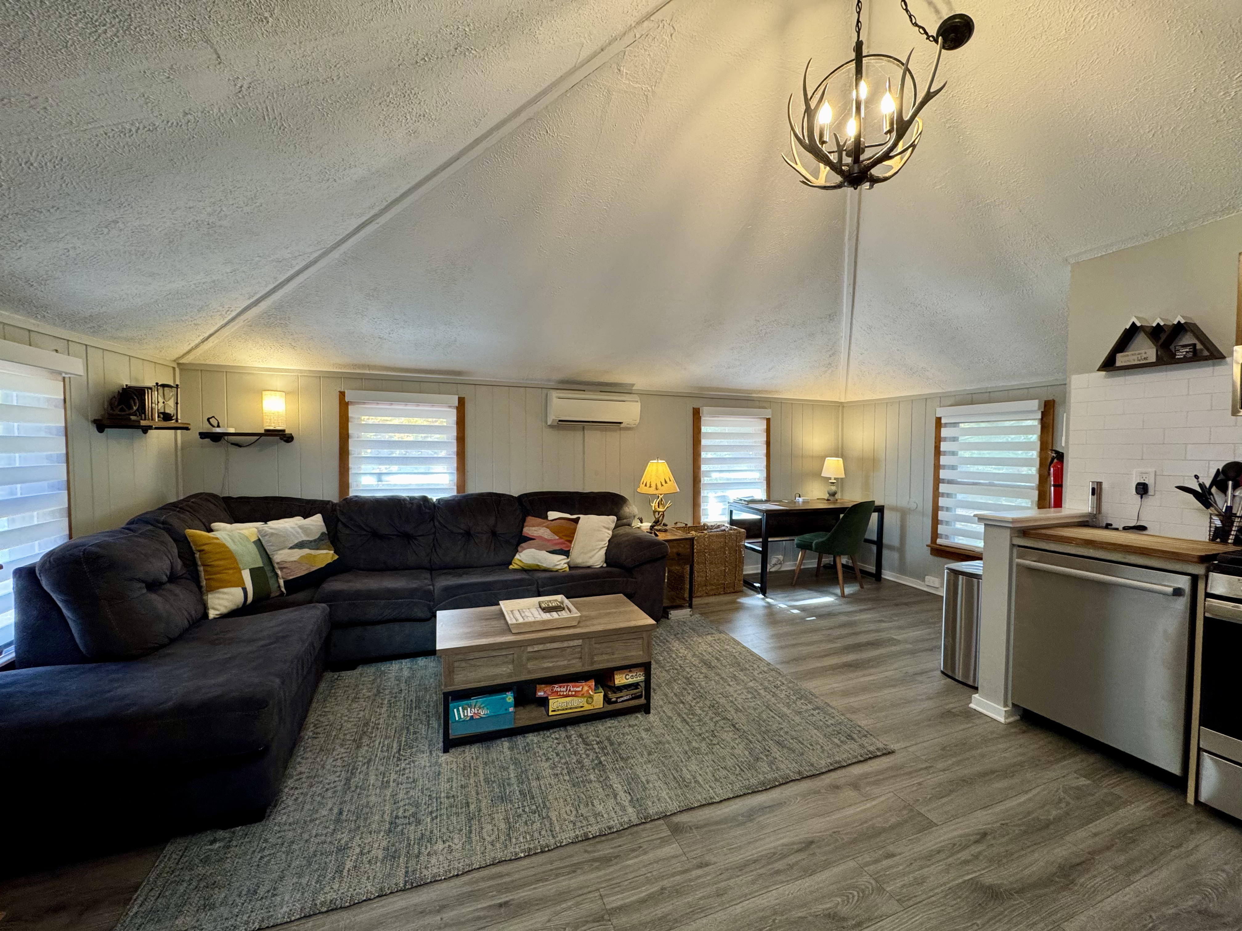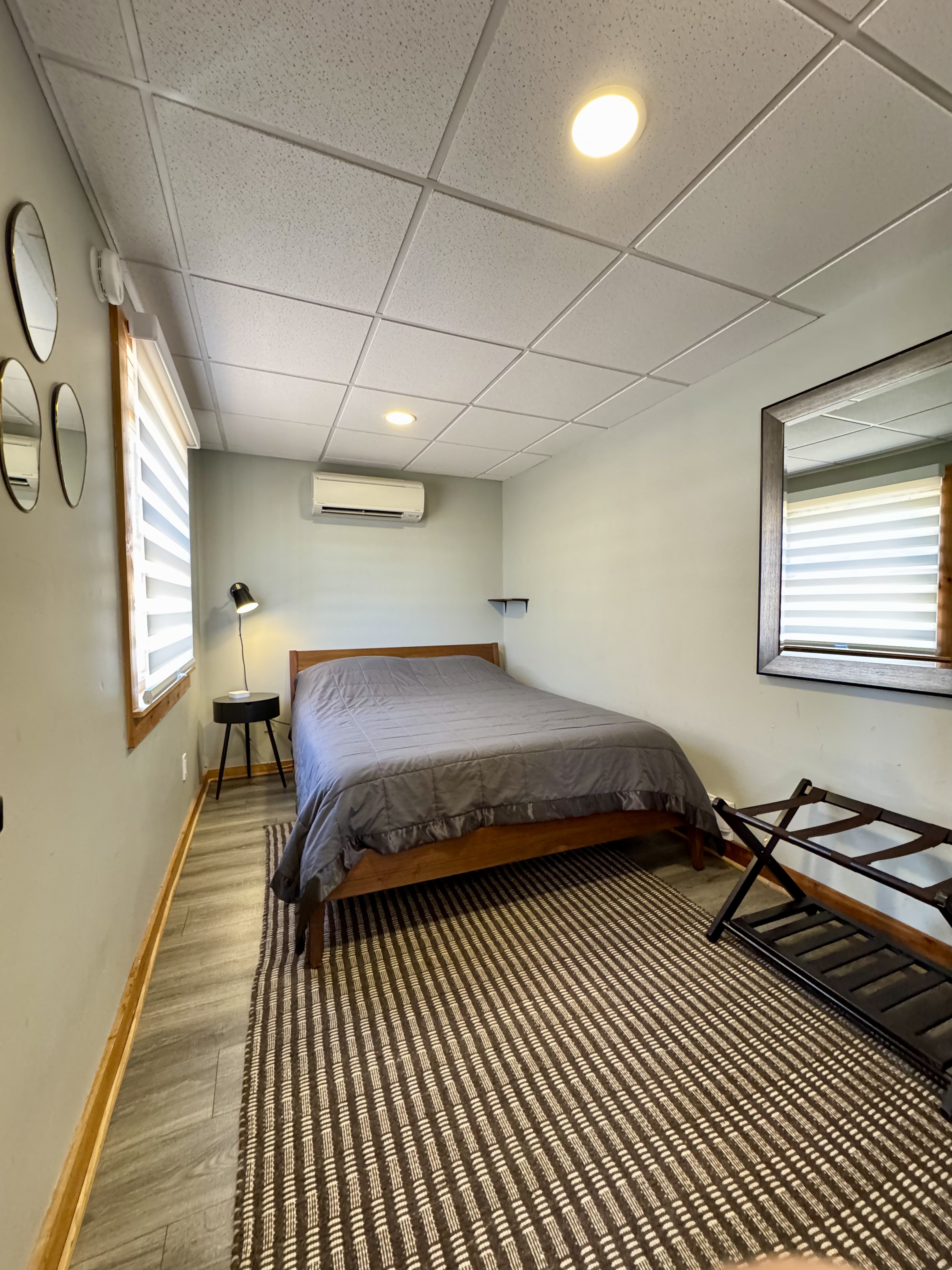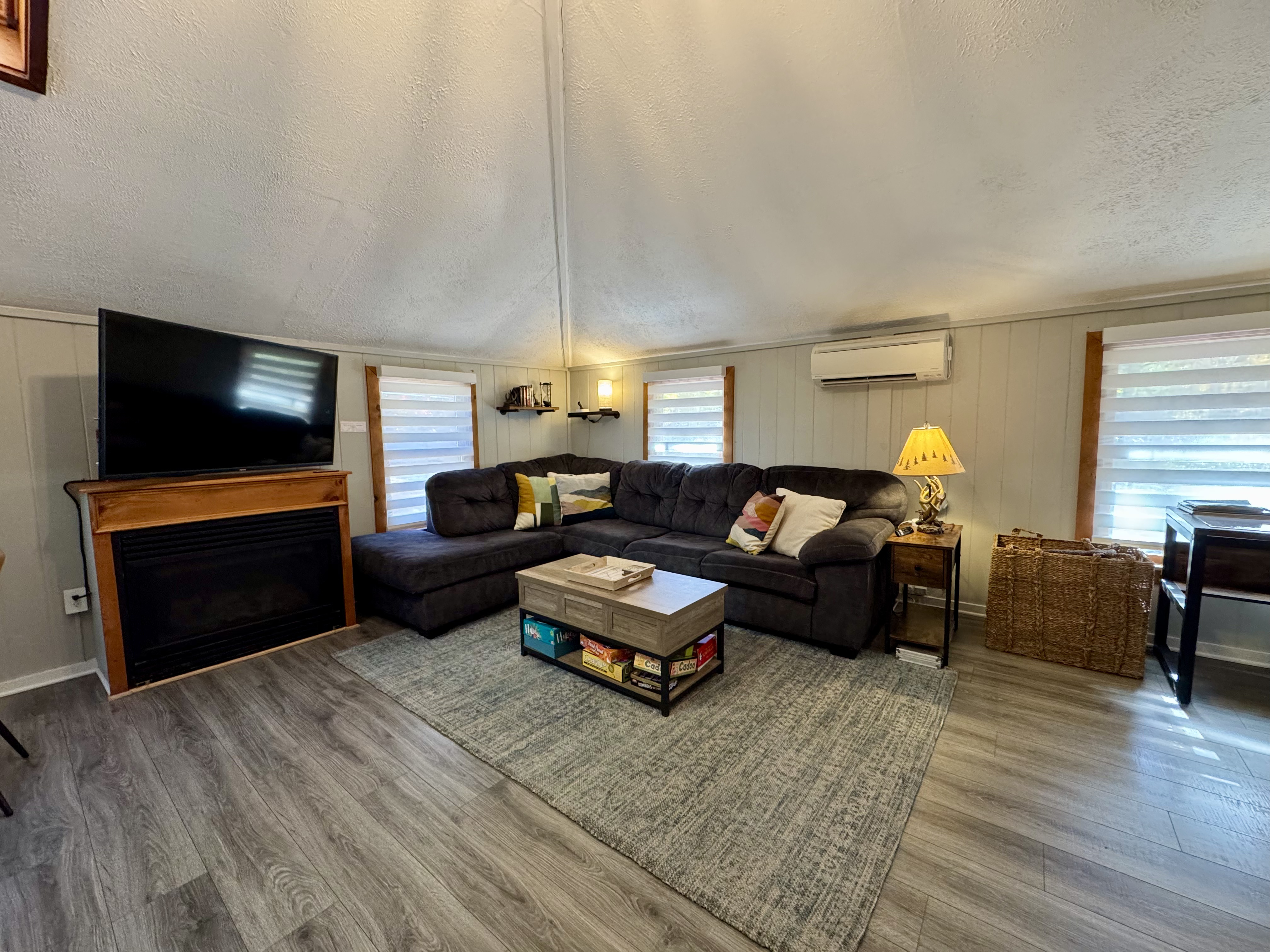 Amenities include new memory foam mattresses in both bedrooms located on the first floor, central AC and a new kitchen and bathroom in 2021. The upstairs of the home includes the kitchen, dining and living room area, a gas fireplace and bathroom.